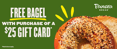 One promo per purchase. Offer for free bagel can be claimed and redeemed from 11/1/2025 through 8/31/2026. Promo code redeemable online only at panerabread.com or in the Panera Bread app. Offer subject to change. Other restrictions may apply. See www.panerabread.com/freebagel for complete details.